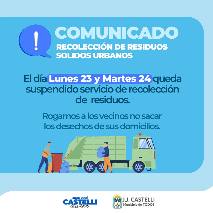Informamos a la comunidad que los días lunes 23 y martes 24 el servicio de recolección de residuos estará suspendido .